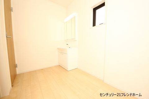 広い洗面所なので、脱衣スペースをもうけたり、衣類の収納も置く事が可能です。
