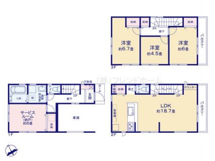 【間取図】1Fには水廻り、2Fはリビング、3Fは各居室となっております。