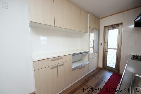 【キッチン】人気のシステムキッチン完備。背面には便利なカップボードも完備♪
