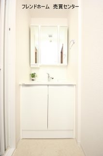 三面鏡付きの洗面台は散らかりやすい小物類も沢山収納可能です。
