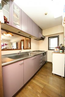 ラベンダー色のキッチンは豊富な収納力です!