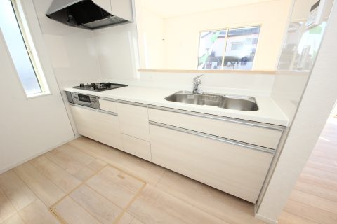 白を基調とした清潔感のある対面式システムキッチン完備。