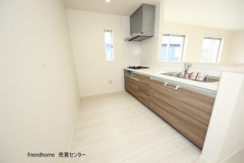 木目調のシステムキッチンは広々!家族で並んで調理も可能です!