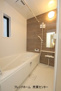 木目調のアクセントパネルの浴室や三面鏡つきの洗面台など