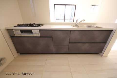 くすみがかったグレーのシステムキッチンです。汚れも目立たず、とても素敵です。