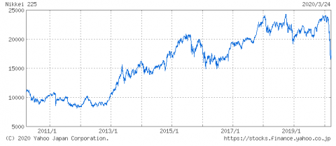 上記グラフは、過去10年間に期間を広げた日経平均の推移です。
