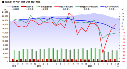 一方、首都圏の中古戸建の成約数も、マンション同様に緊急事態宣言下では急落しましたが、こちらも大幅に回復。7月には前年同月比+2.4%となっています。