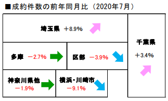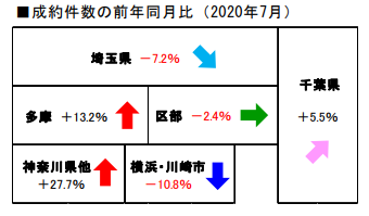 緊急事態宣言が発令された4月に急激に水準を落とし、7月に向かって急上昇していることがわかりますね。2020年7月は前年同月比-2.4%ですが、4月に-50%以上と大きく成約数が落ちたことを考えれば急回復しているといえるでしょう。