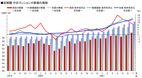 現在は、中古戸建、中古マンション、ともに相場価格が高騰しているとき。中古戸建は7カ月連続、中古マンションは5カ月連続で成約平米単価が上昇しています。