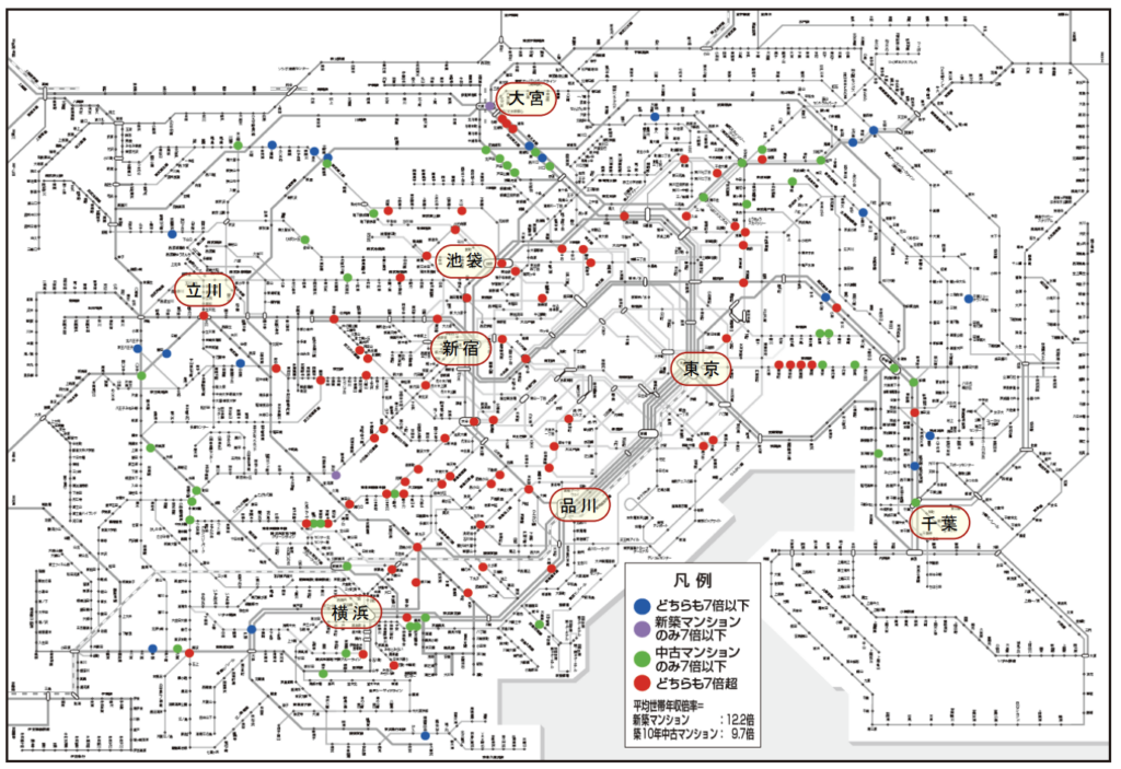 東京カンテイが5月に発表したレポートによれば、年収800万円世帯における世帯年収倍率7倍の新築マンション、築10年の築浅マンションが供給されている駅は、首都圏でわずか20駅。14.5%に留まりました。平均世帯年収倍率は、新築マンションが12.2倍(平均価格9,784万円)、築10年の築浅マンション(平均価格7,760万円)が9.7倍です。